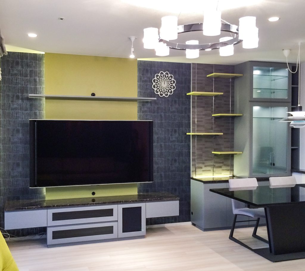 棚は可動式で背面はエコカラット、下部には間接照明と