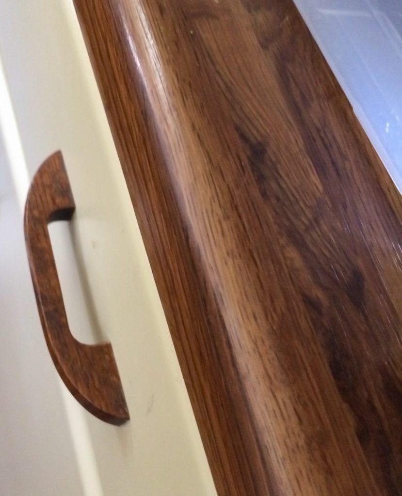 既存の天板に近い面材を選んで頂き、取っ手はキッチンという場所柄